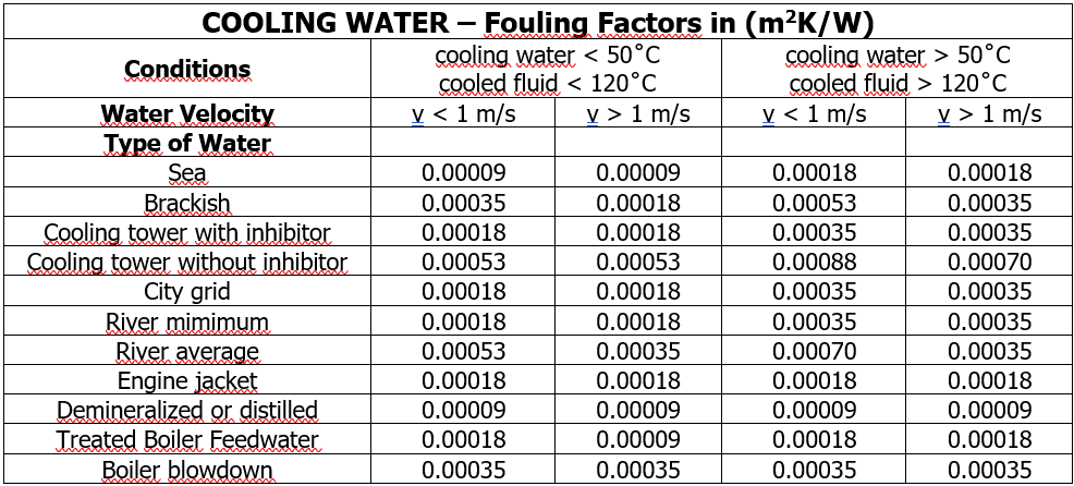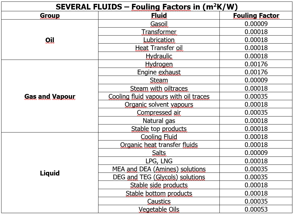 The following list contains fouling factor values for heat exchanger design under different fluids, including more specific types. However, determining the most appropriate values for a specific application generally requires experience and careful analysis.